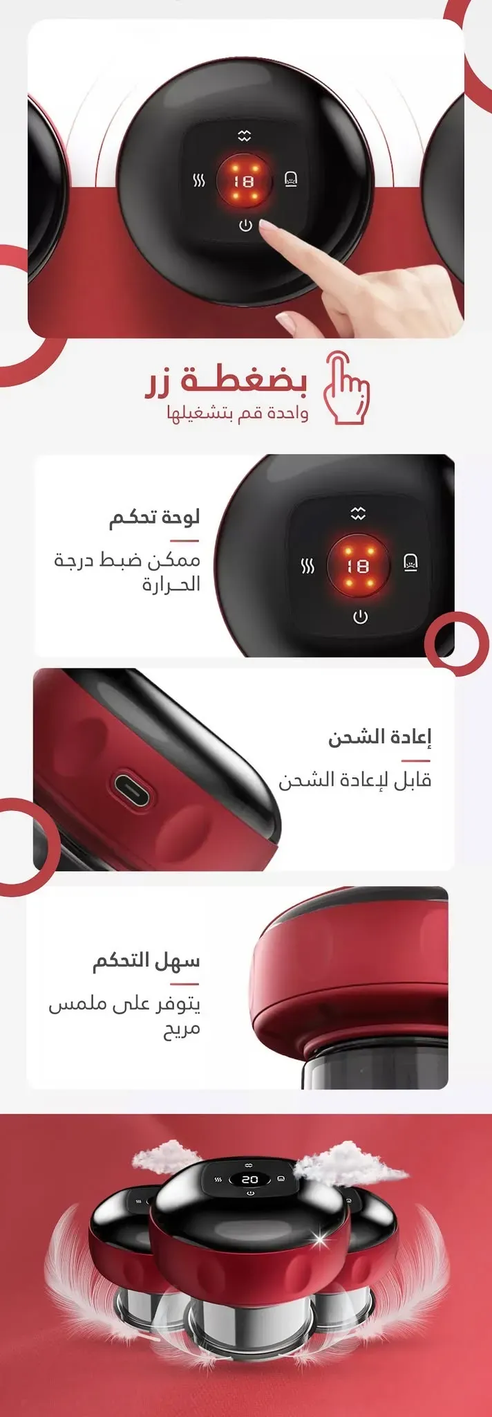 🔥 العلاج بالحجامة : يستخدم هذا الجهاز كوب شفط فراغ لجذب الجلد والعضلات إلى أعلى لتعزيز الدورة الدموية وتخفيف الألم.